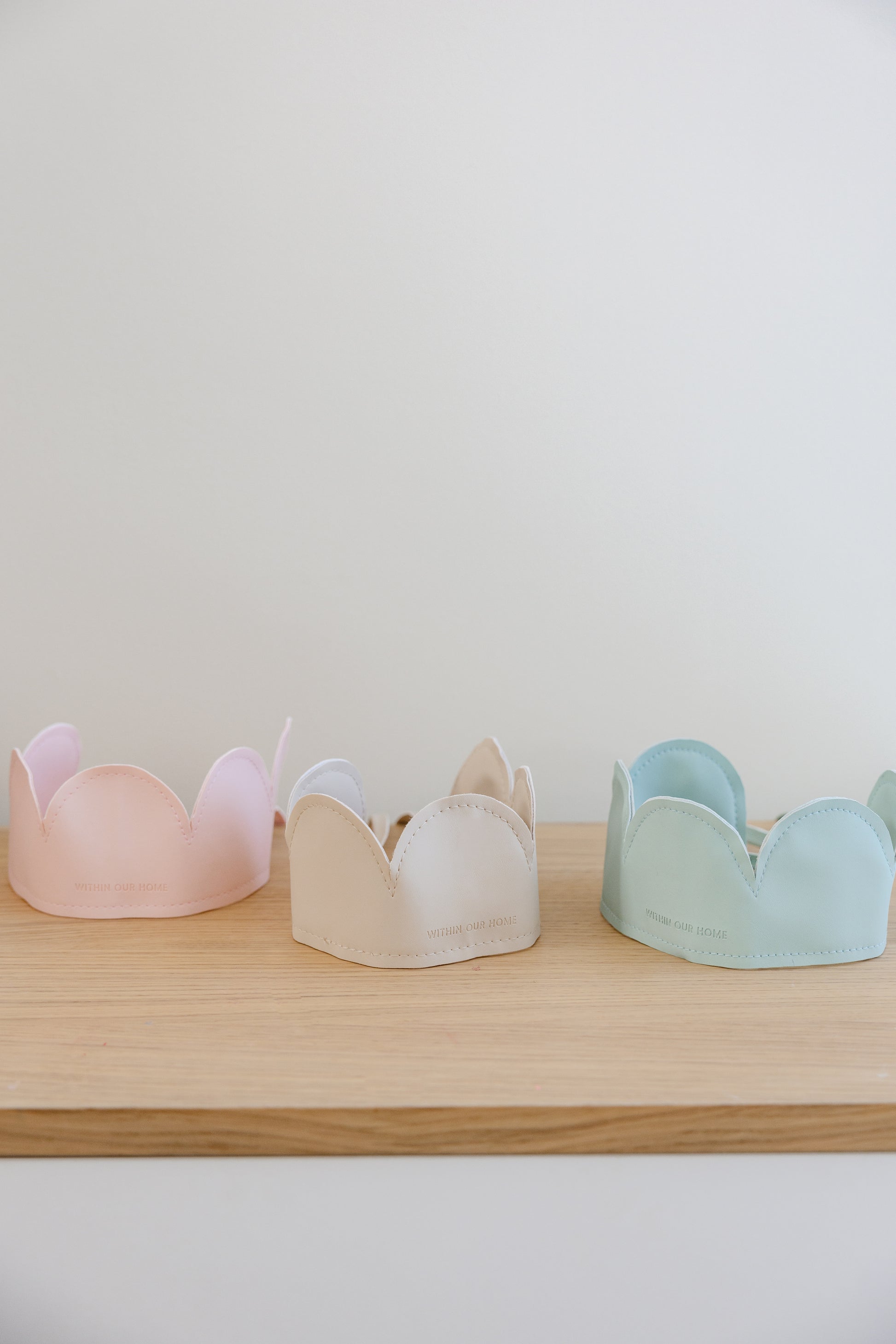 Crafted from vegan leather, the crown features a ribbon tie for a comfortable fit across ages.